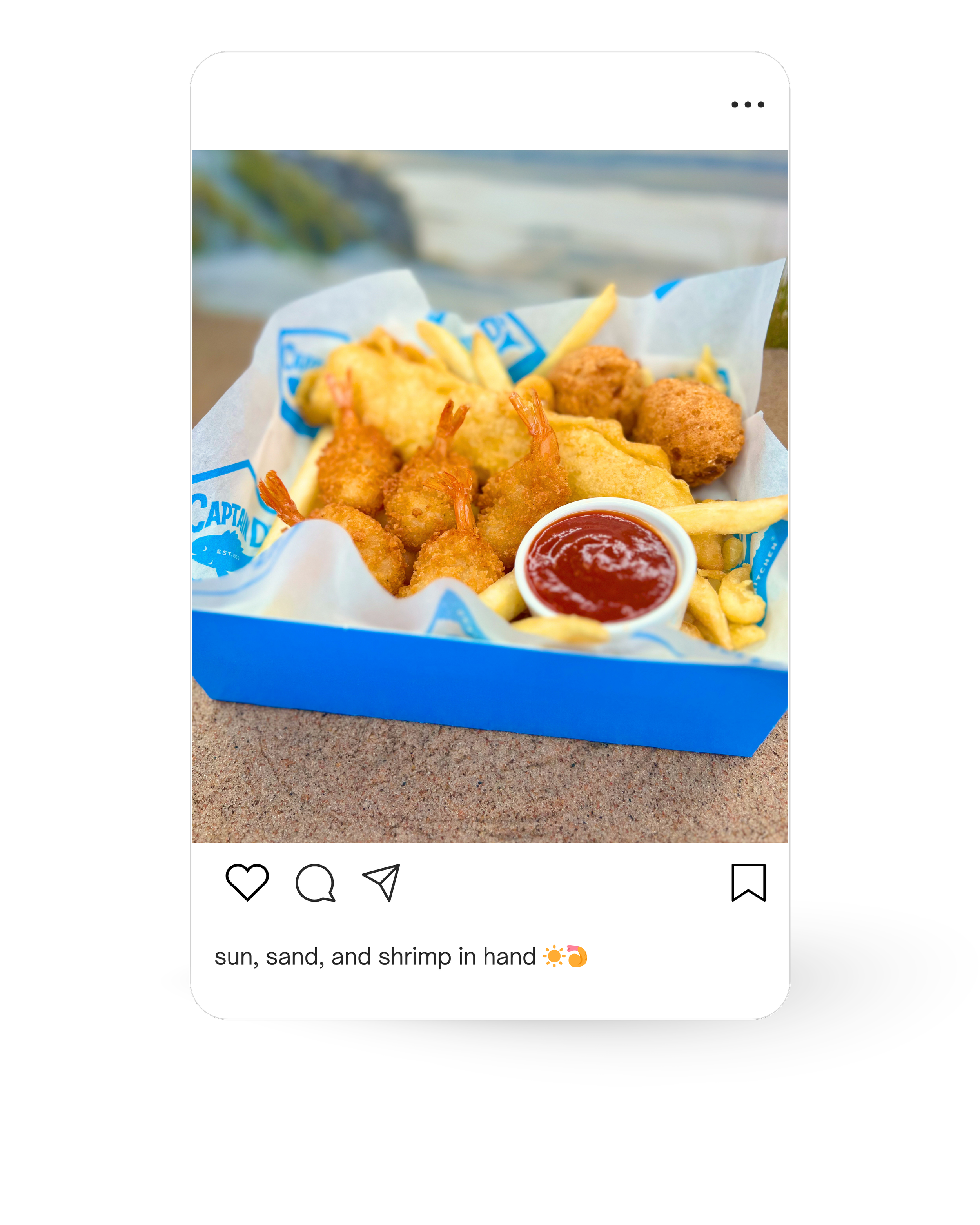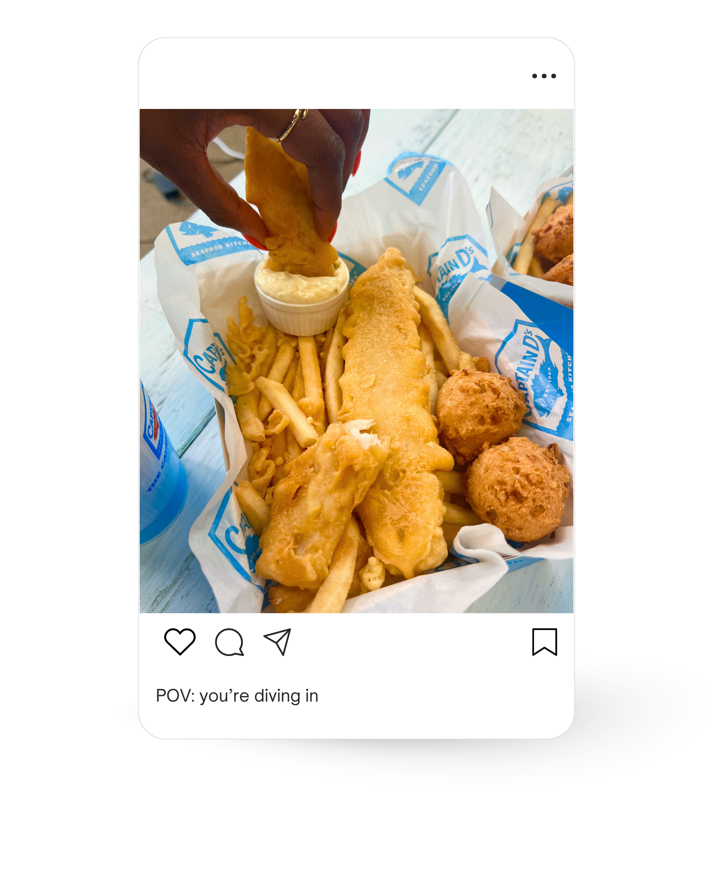 Film a Reel showing the experience of enjoying Captain D’s - you see the sign in the distance, walking up to the front door and opening it, ordering at the register, sitting down to your meal, dipping shrimp in cocktail sauce, taking a bite out of fish, and smiling looking content.